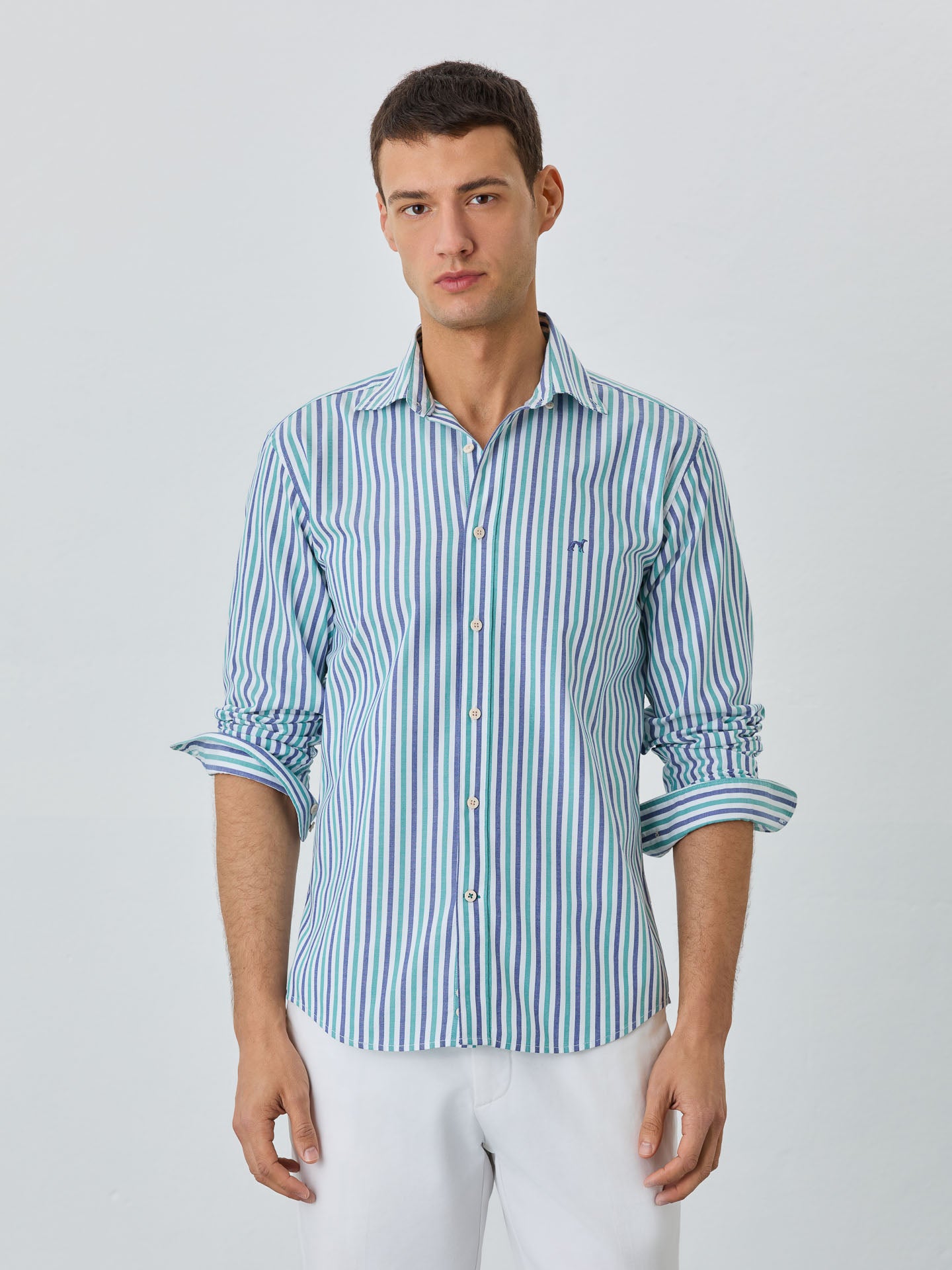Slim Fit Shirt With Open Collar in BCI Cotton With Stripes