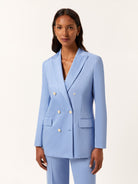 Double-breasted blazer with peak wider lapel, long sleeves with two button cuffs and two back slits. Expertly tailored from Lyocell & Cotton blend fabric, crafted in Portugal. Features a regular fit, fully lined interior and two front flap pockets.