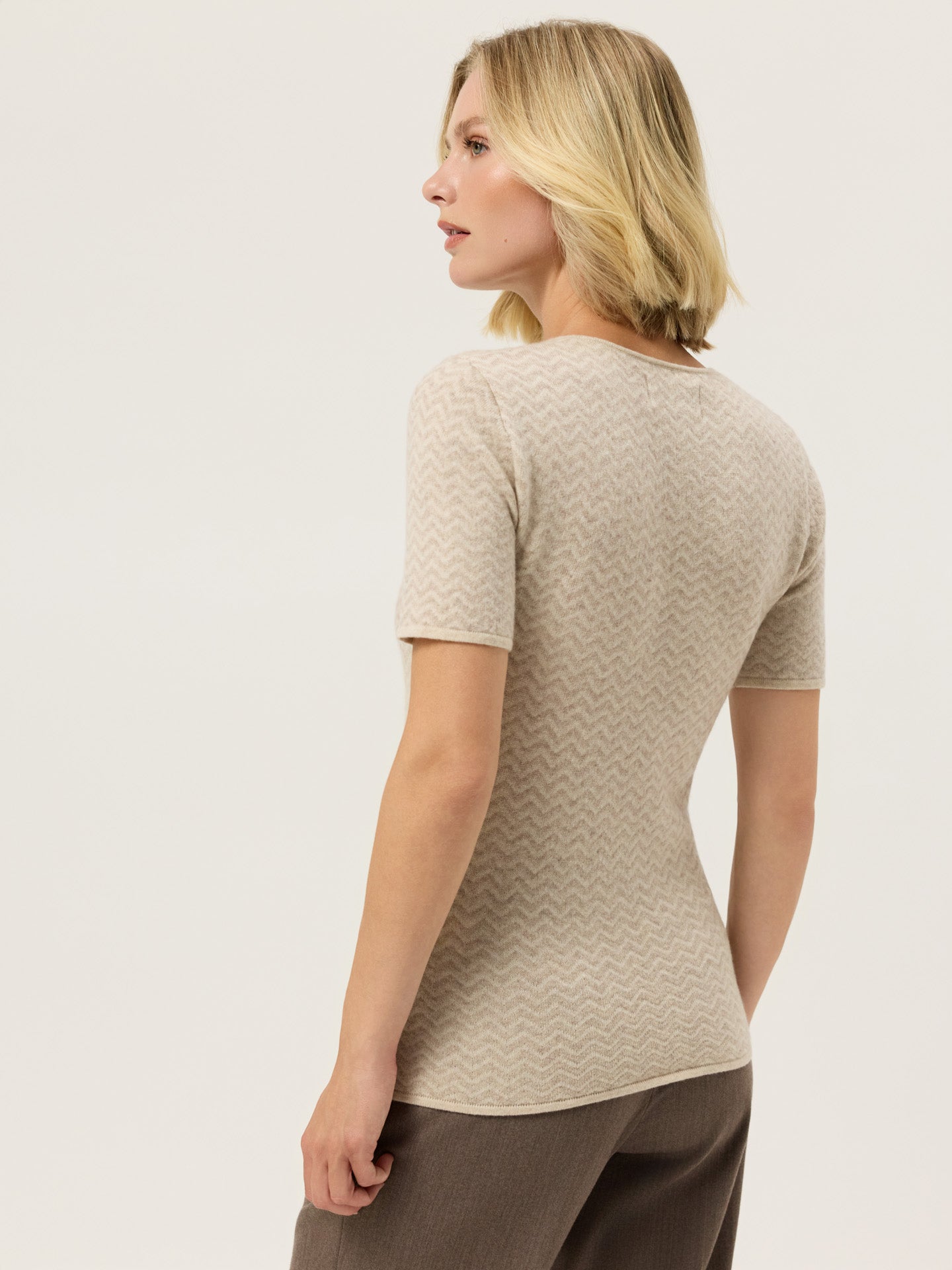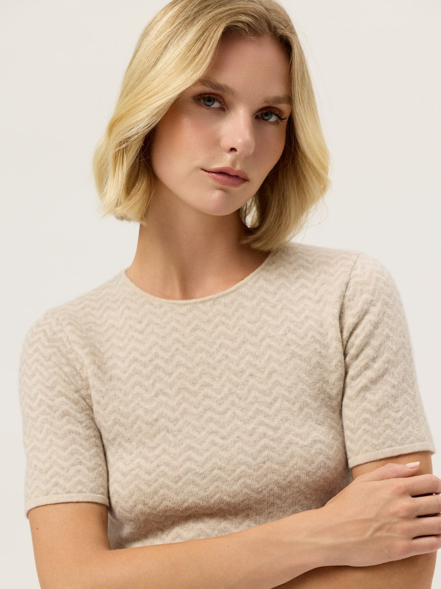 High Neck sweater made from premium Merino Wool and Recycled Polyester blend. Designed with a high neck, short sleeves and all-over melange herringbone jacquard knit. Special details such as Sacoor Metal plate in Light Gold and solid color ecru stripe trim on neckline, bottom and sleeves.