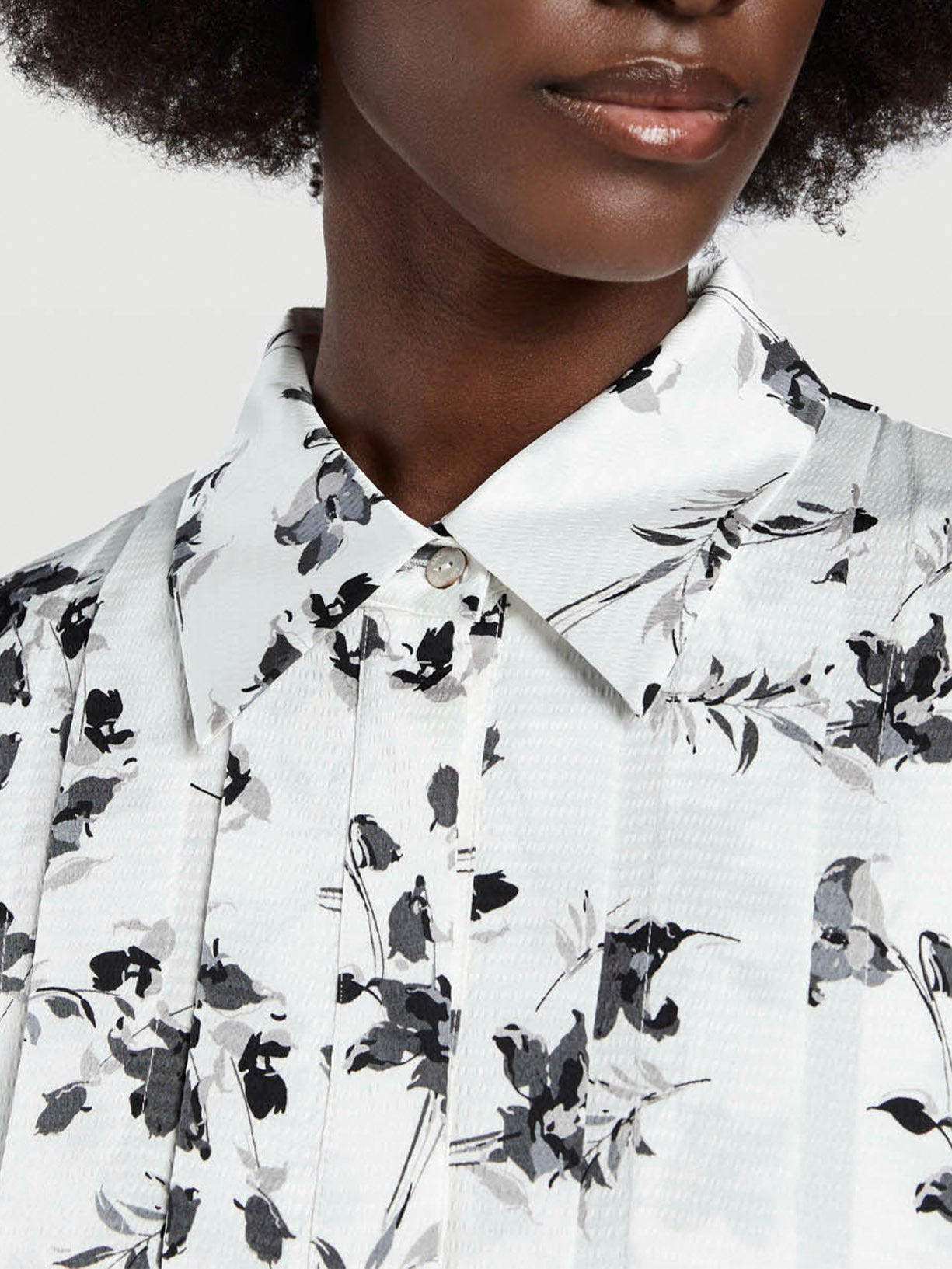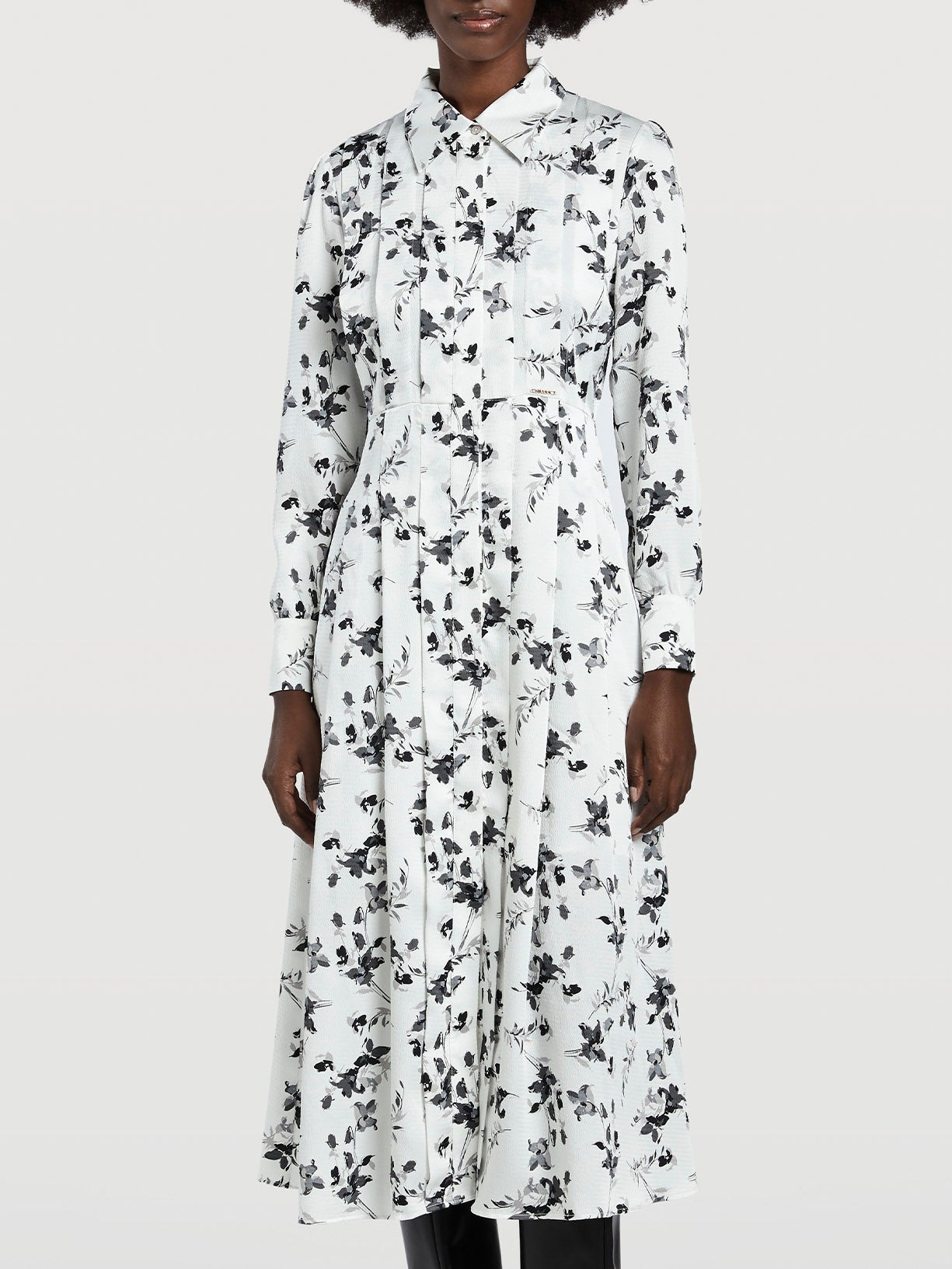 فستان طويل بطبعات زهور على كامل التصميم. يتميز بطيات في الأمام والخلف، وياقة واسعة وفتحة بأزرار مخفية. أكمام طويلة مع أساور بزر واحد وخصر محكم. لوحة معدنية تحمل العلامة التجارية في الأمام.