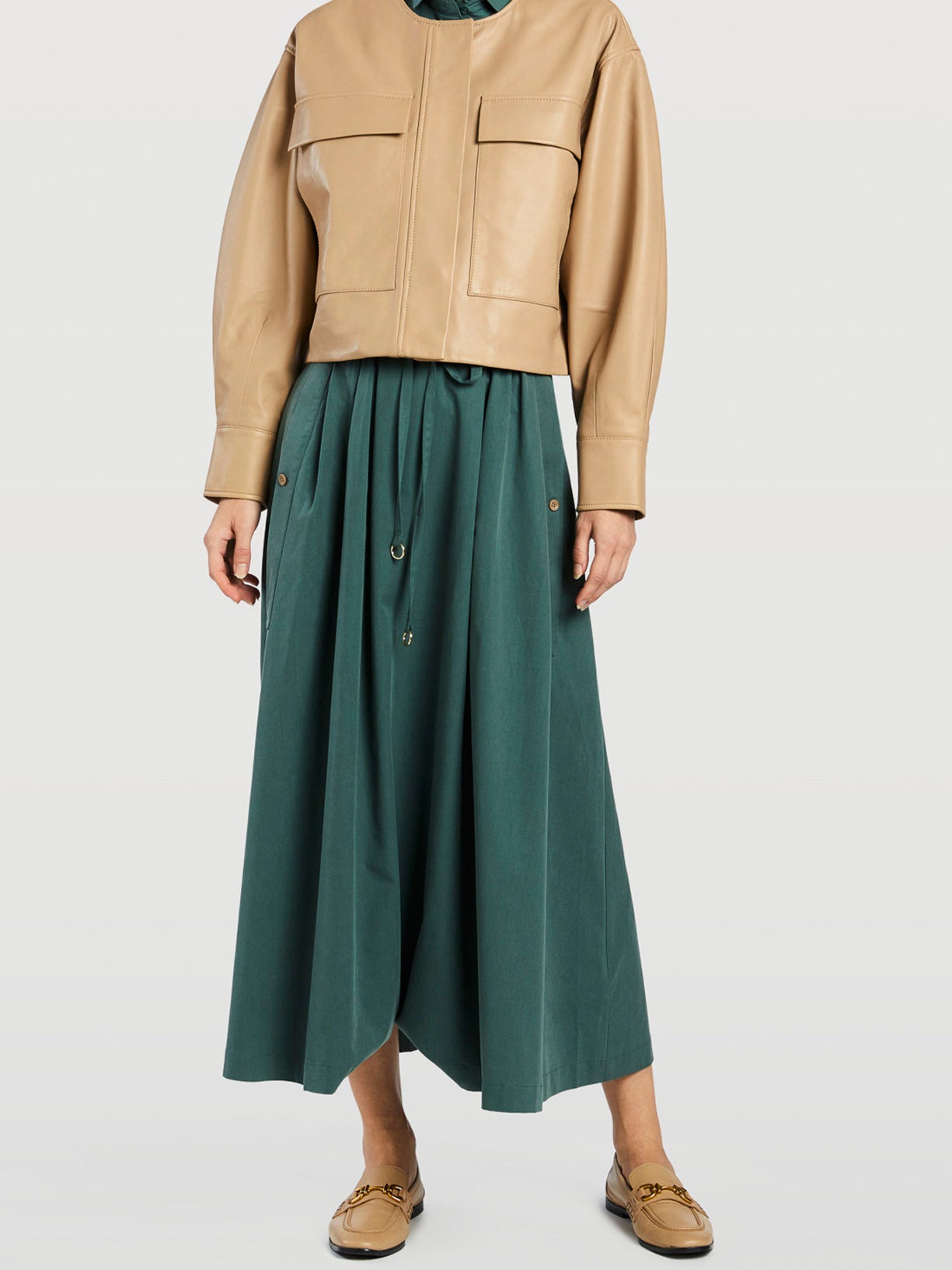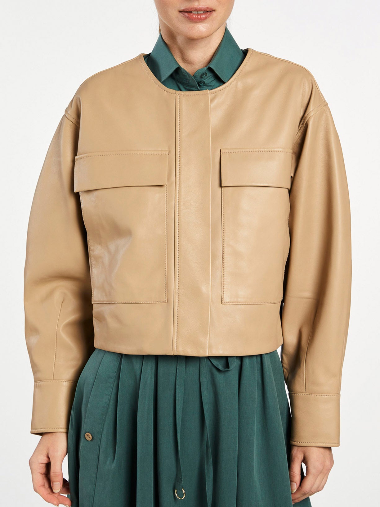 سترة جلدية قصيرة بياقة دائرية وقصة عادية. يتميز بجيوب مسطحة كبيرة مع مدخل جانبي. فتحة أمامية بسحاب مخفي وأزرار كبس. أكتاف منسدلة وأكمام طويلة ضخمة مع أساور من الجلد الذاتي.