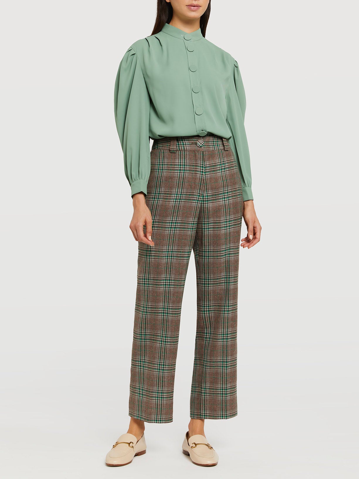 بنطلون بدلة بخصر متوسط ​​وقصة فضفاضة. إغلاق بسحاب وزر من القماش الذاتي، وجيوب جانبية، وحاشية غير مرئية.