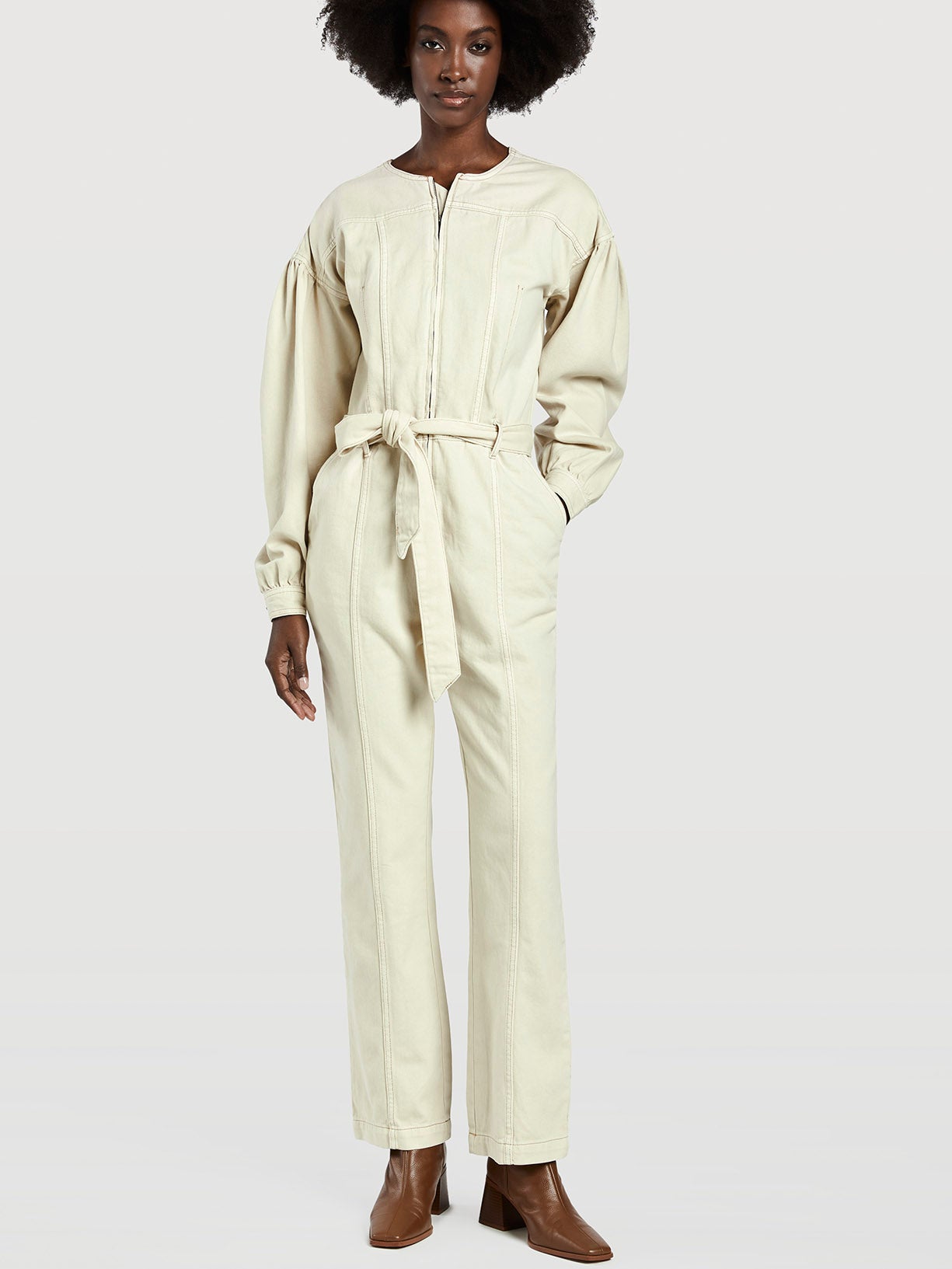 بذلة بمقاس عادي مع سحاب معدني أمامي. يتميز بساق واسعة لمزيد من الراحة، وأكتاف منسدلة، وأكمام طويلة منفوخة مع أساور بزر واحد. جيوب جانبية وجيبين خلفيين. حزام من القماش نفسه، وحلقات للحزام، وحاشية بخياطة واحدة. رقعة جلدية ذات علامة تجارية على الجيب الخلفي.