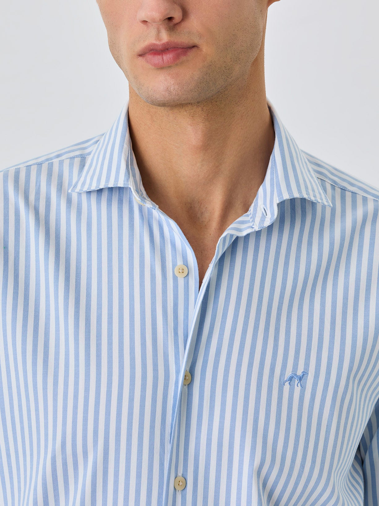 'Respekt' sport shirt made of 100% BCI cotton oxford stripes. Featuring slim fit, open spread collar and front button-up fastening. Long sleeves with single cuffs with 2 buttons. Chest logo embroidery and label 'with love from Lisbon' inside front placket. 'Better Cotton Initiative' - this garment is made with the most ecological cotton: it's production sustains the health of soils, ecosystems and people by using natural processes rather than artificial inputs.