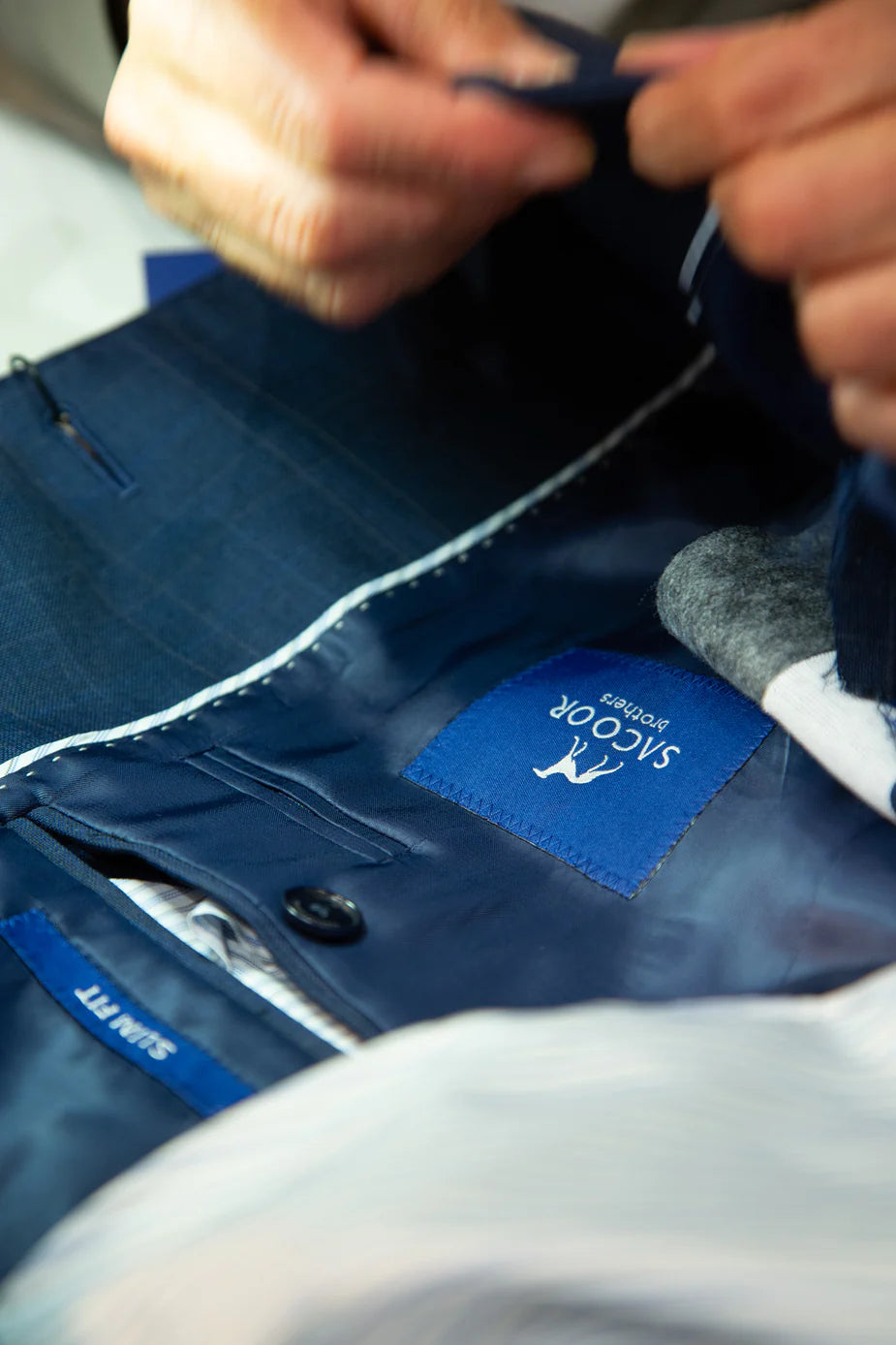 At Sacoor Brothers, we believe that true elegance lies in the details and that every garment should reflect the individuality of the wearer. That’s why we offer a free in-store tailoring service, exclusive to garments purchased from us. This service ensures that every customer enjoys a perfect fit, combining comfort and sophistication with every seam.