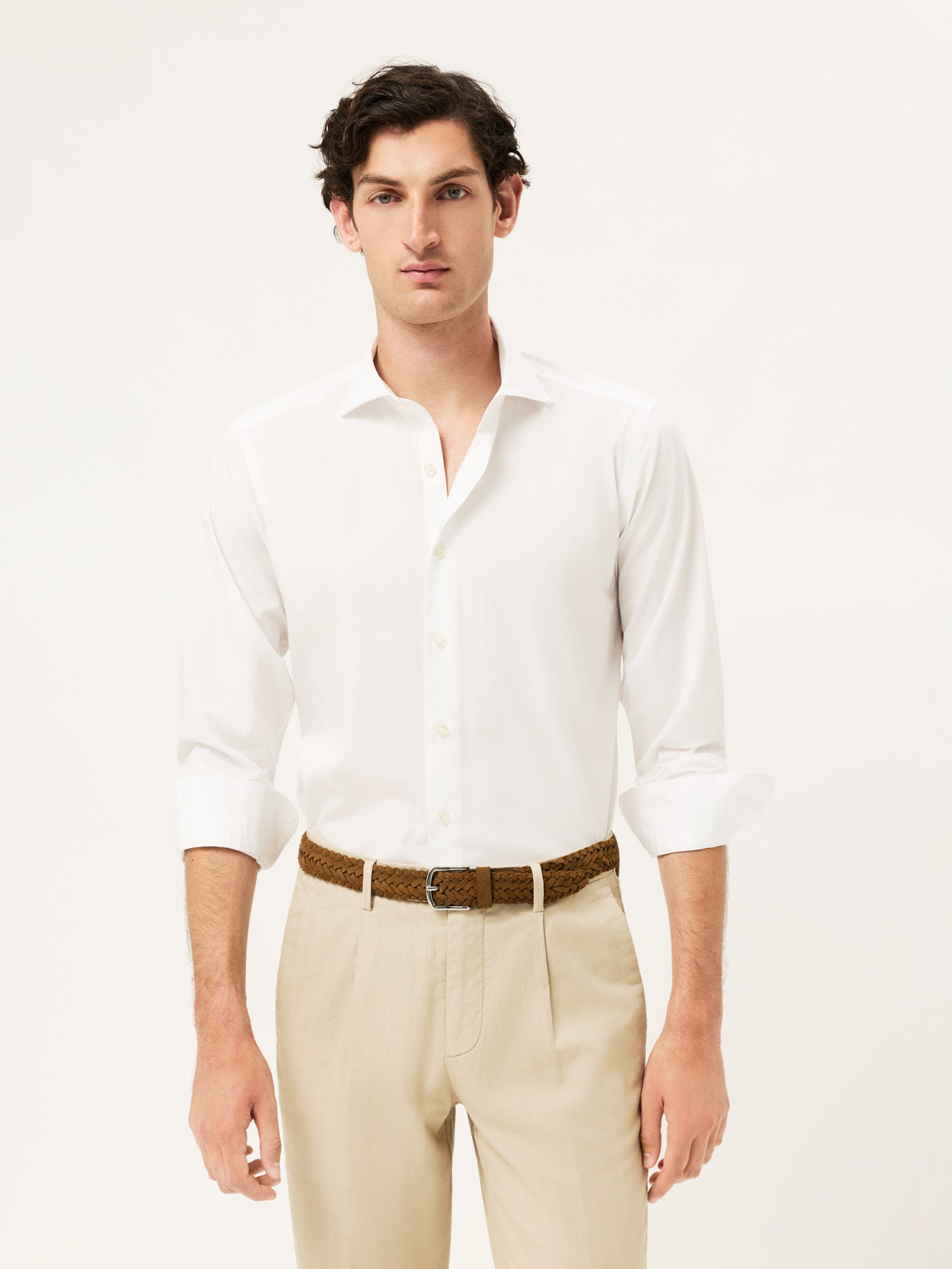 This long-sleeve shirt is cut in a slim fit from poplin fabric, offering lightweight comfort and refined structure. It features a Newport collar, single placket, and standard cuffs. The shirt includes a discreet pleat on the sleeve, triangle inserts at the side seams in self-fabric, a horizontal last buttonhole in contrast thread, and off-white buttons. Detailed with removable collar stays, and reinforced construction for durability. Available in regular fit sizes starting from size 44. This shirt is perfect for office wear and any occasion where a sharp look matters.