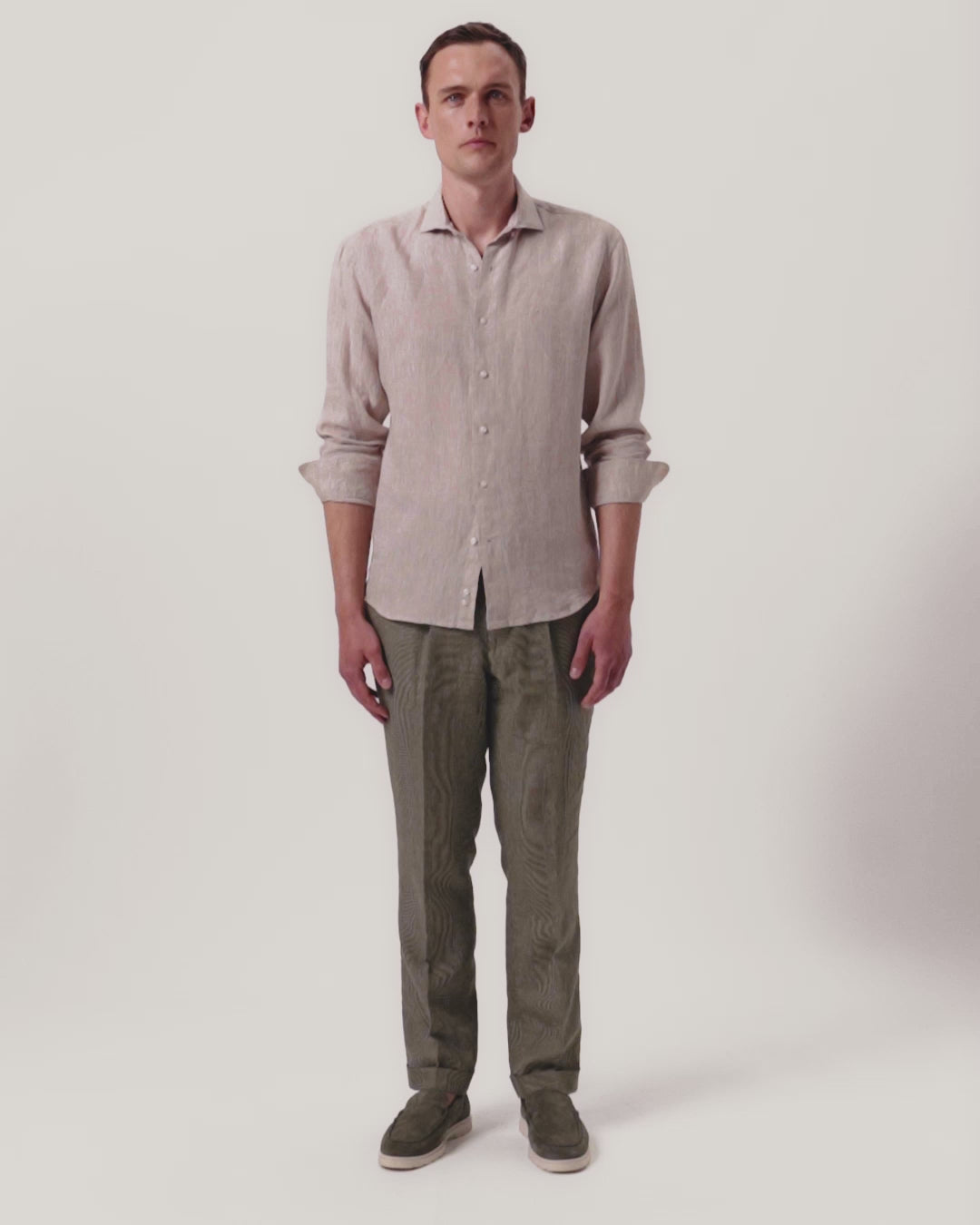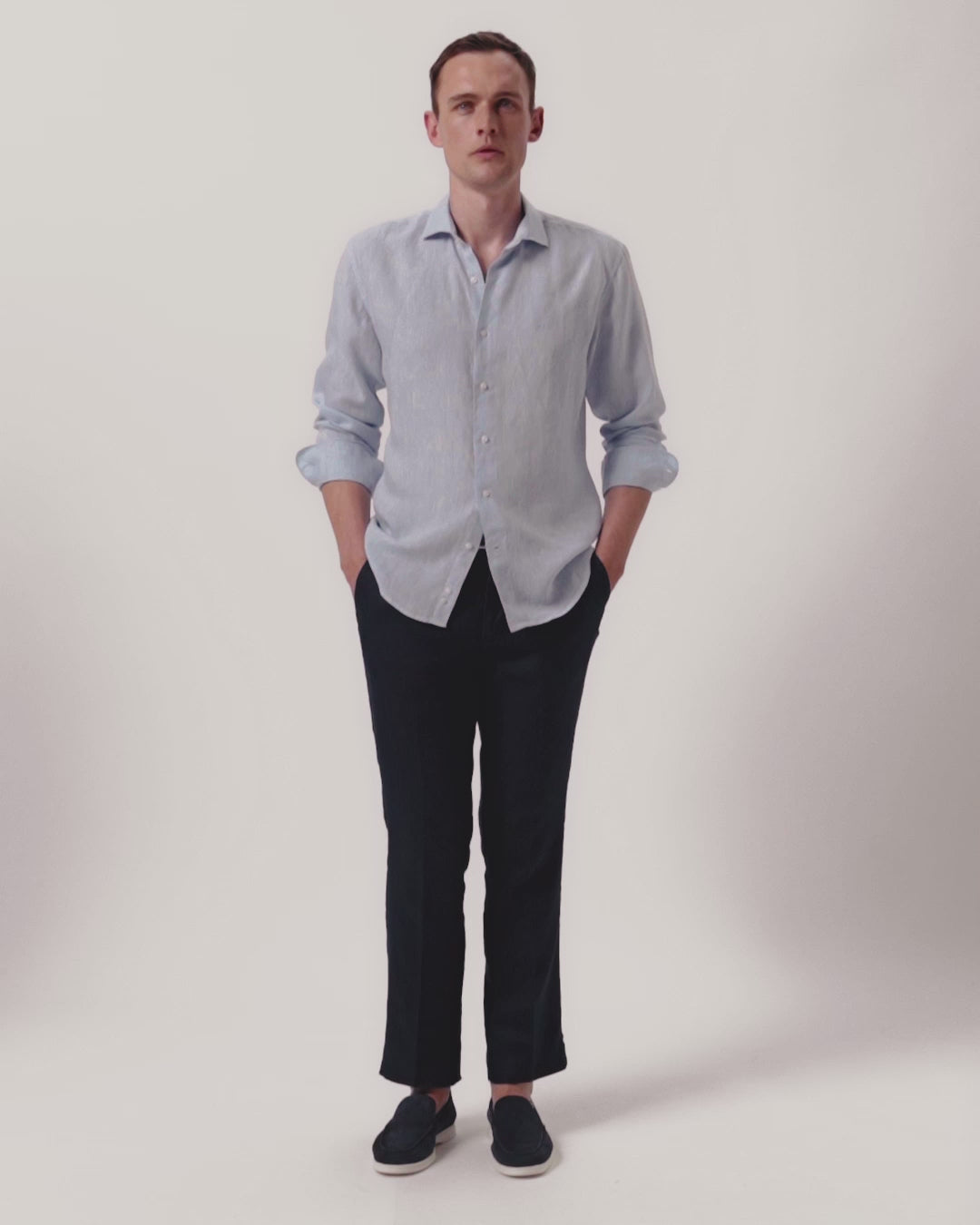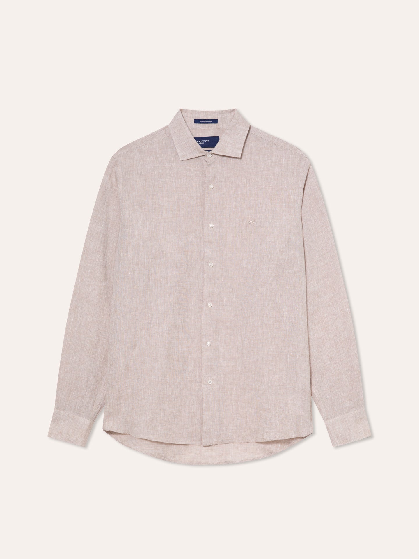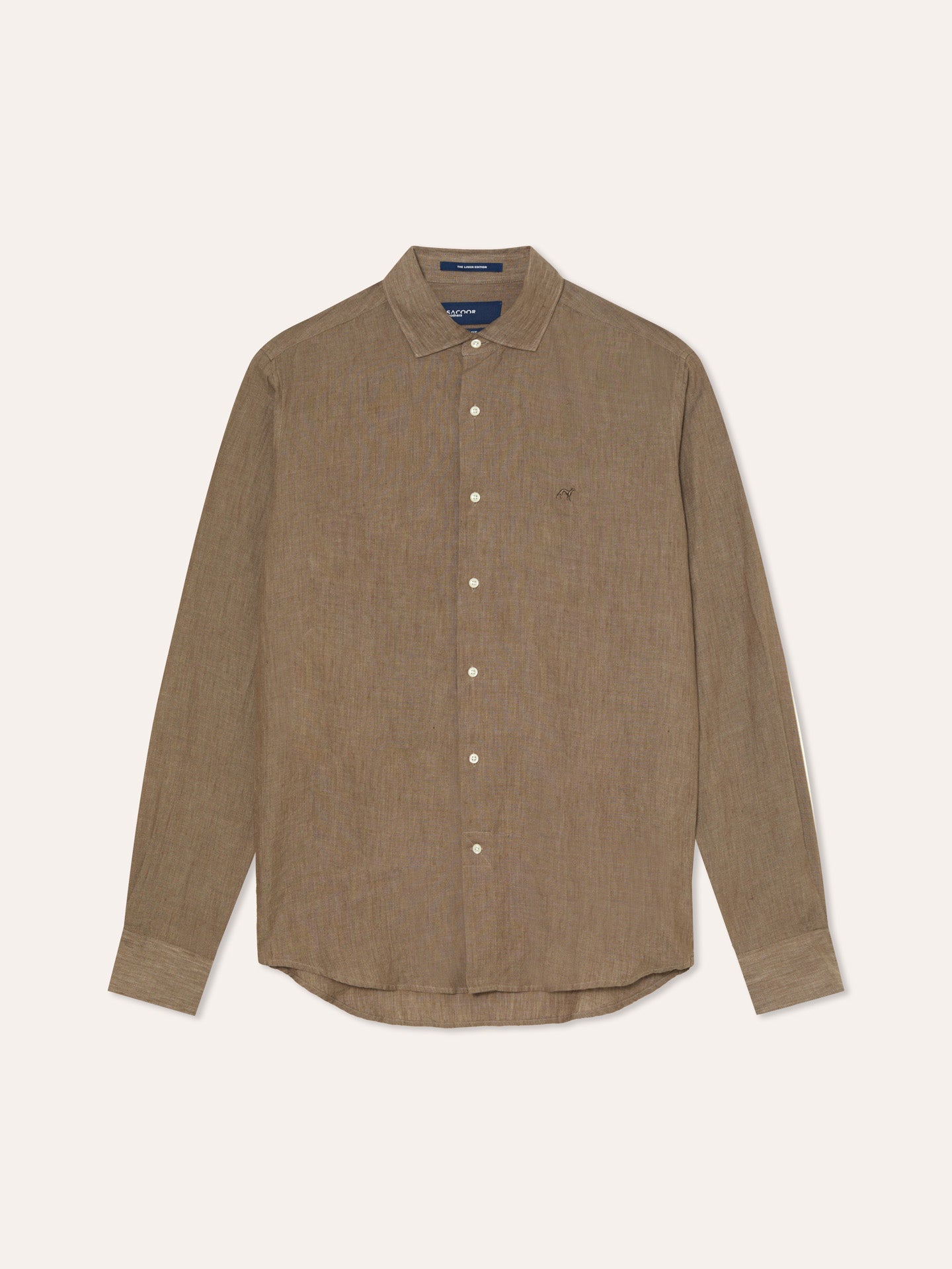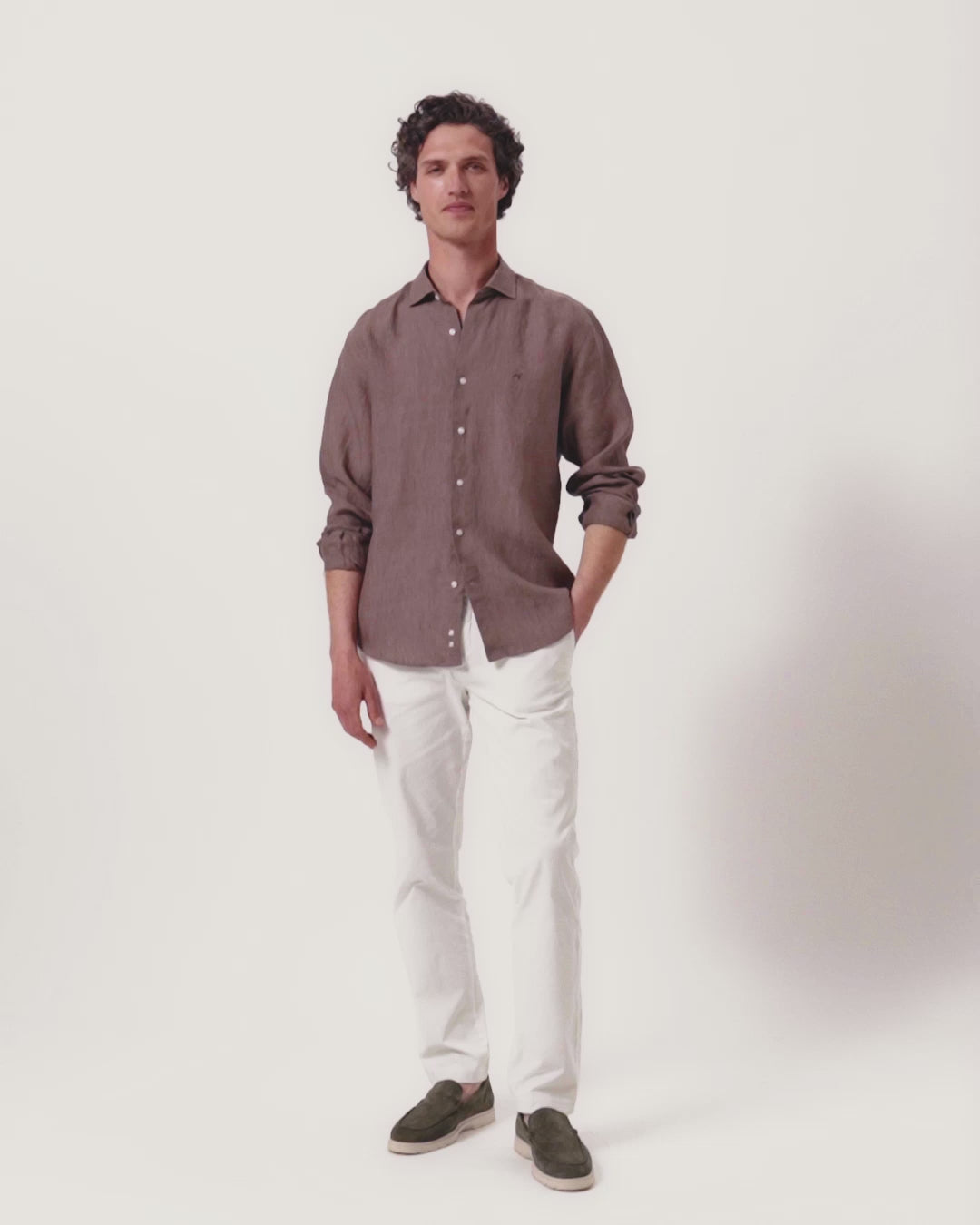 Introducing the Slim-Fit Shirt in a premium linen quality—crafted from 100% high-quality linen, this shirt offers a soft, breathable feel, perfect for both comfort and style.This shirt combines the natural comfort and refreshing texture of linen, offering a sophisticated yet relaxed fit ideal for elevated casual occasions. The slim fit provides a tailored silhouette that flatters the figure, while the open collar and front button-up fastening give it a contemporary and refined look. Long sleeves with single cuffs and two buttons enhance the shirt’s sleek design, while the chest logo embroidery in matching fabric adds a distinctive touch. An essential addition to any wardrobe, this shirt seamlessly blends style with comfort, exuding an effortless yet premium appeal.