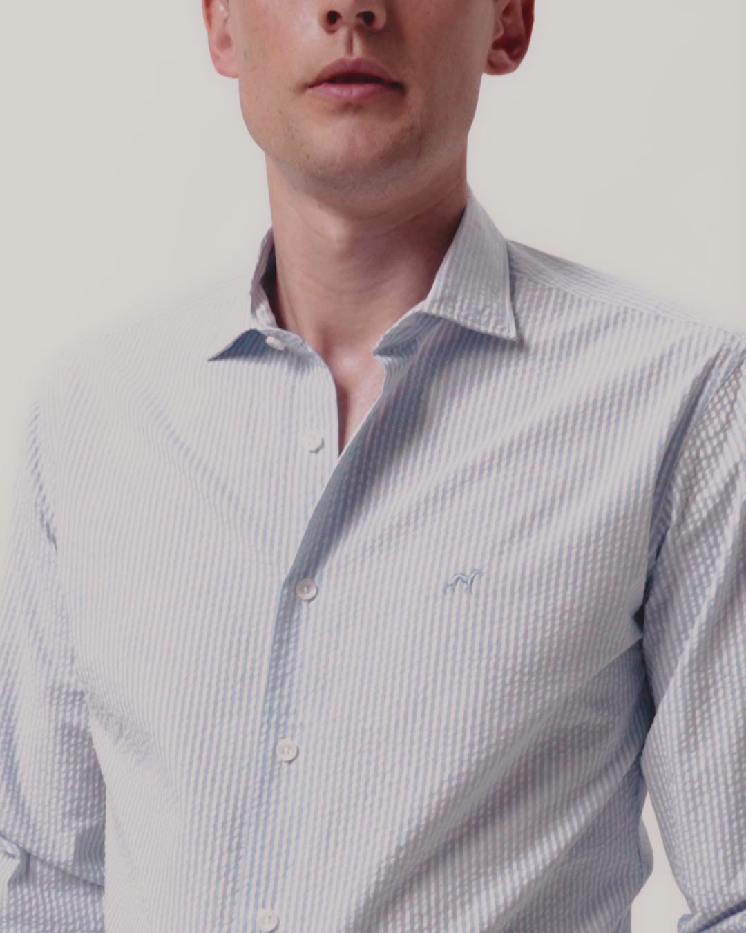 Slim Fit Striped Seersucker Shirt in Cotton Elastane with Open Collar