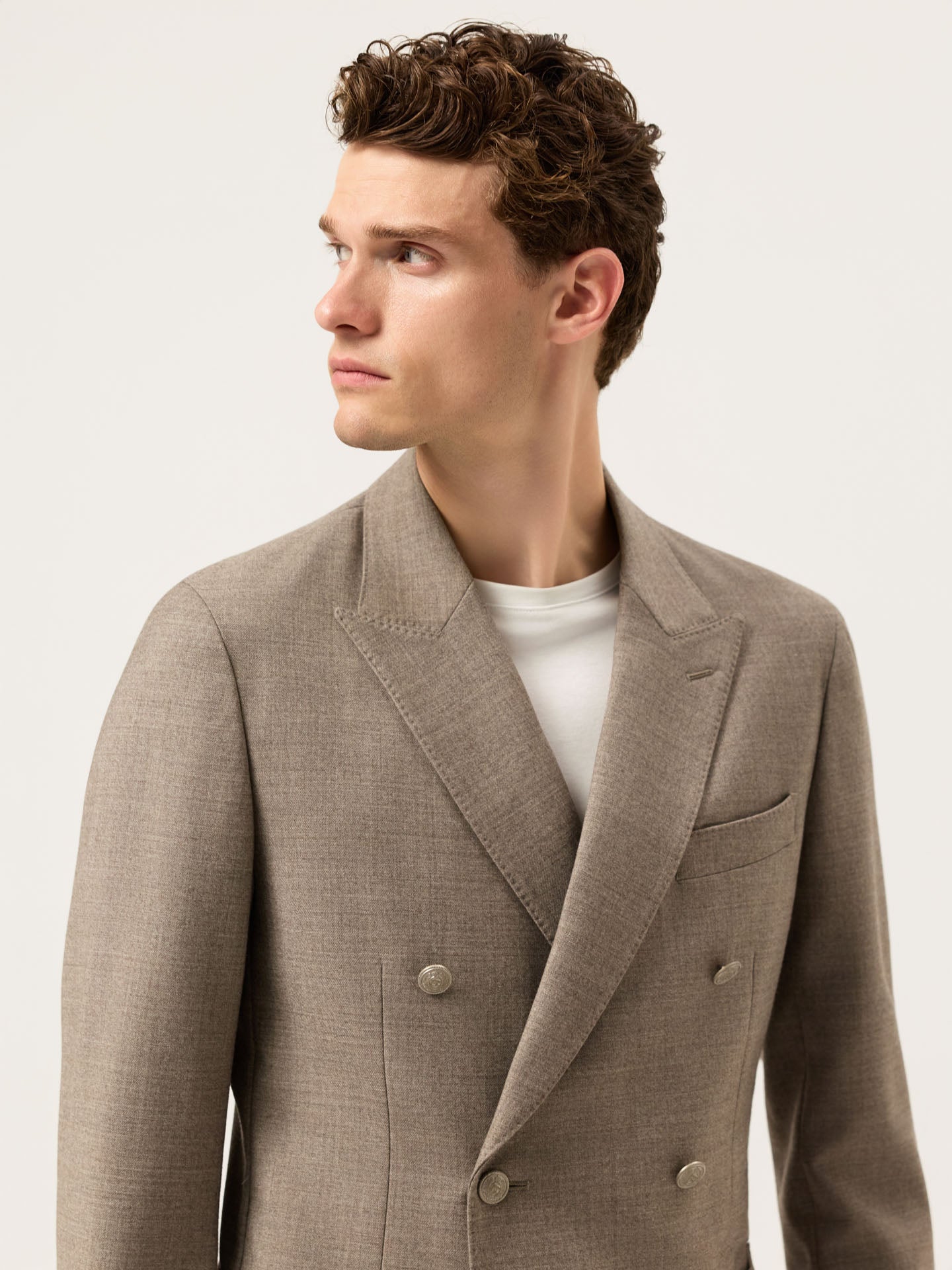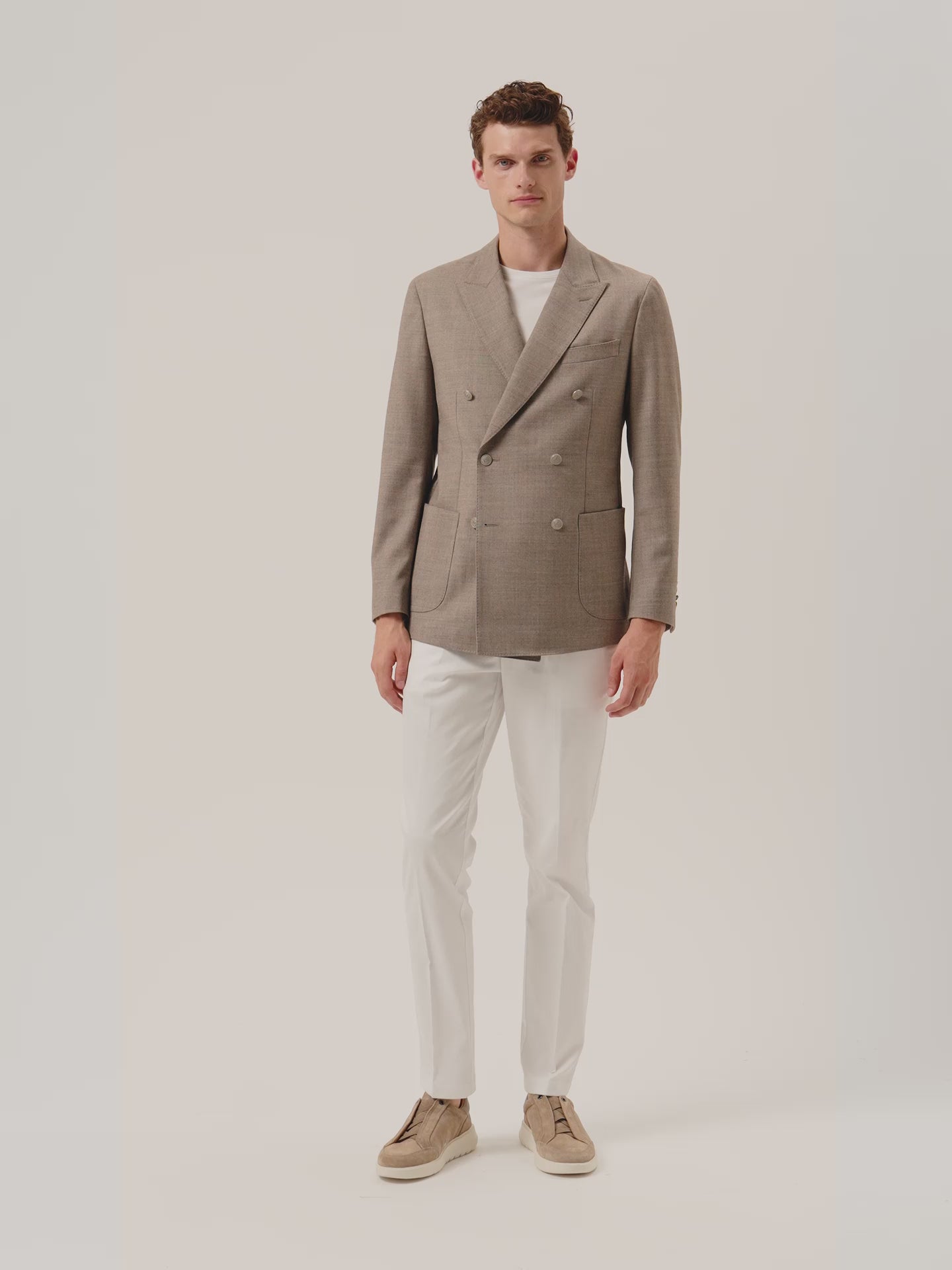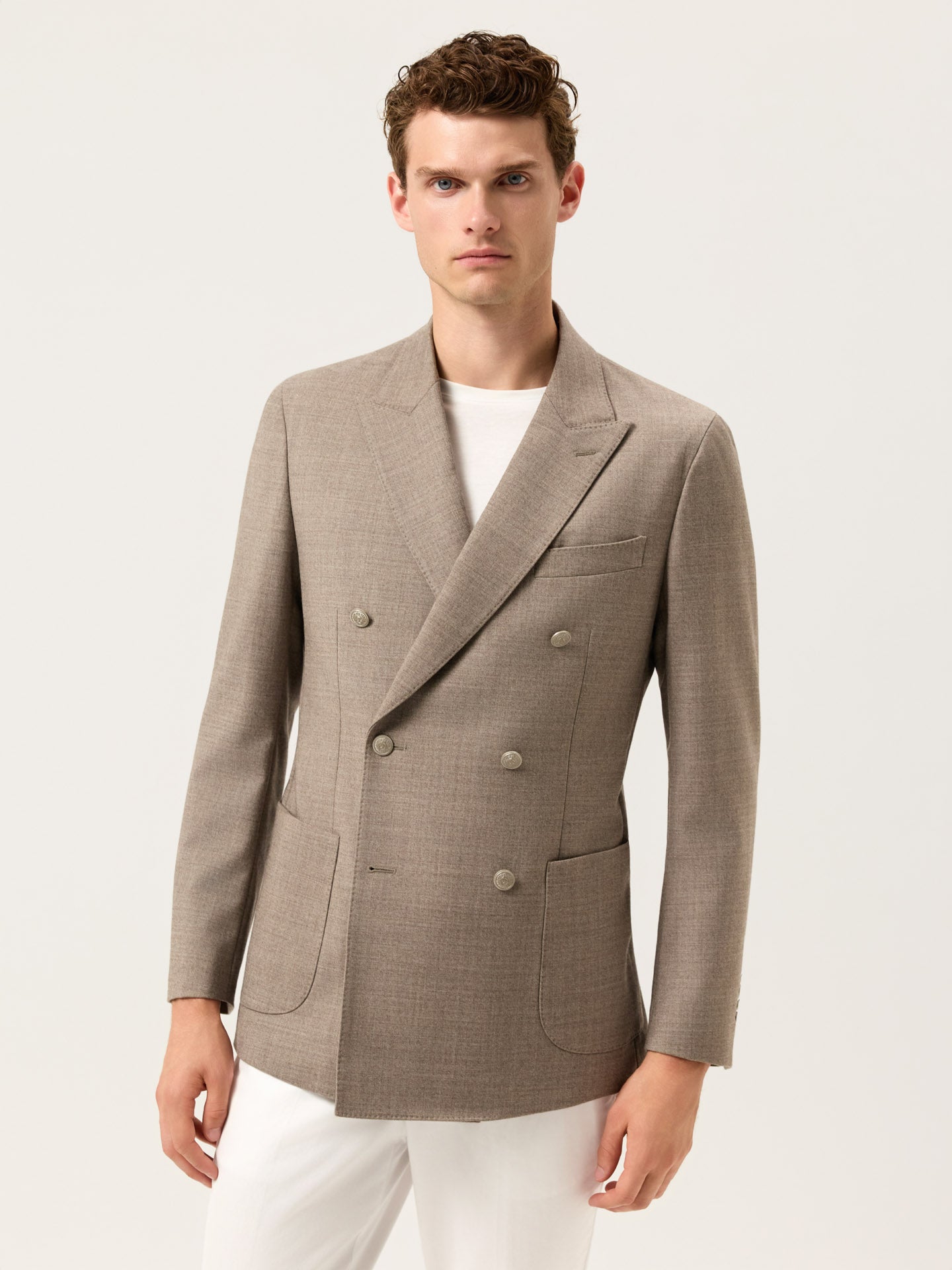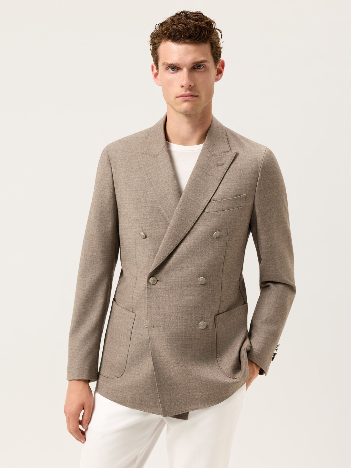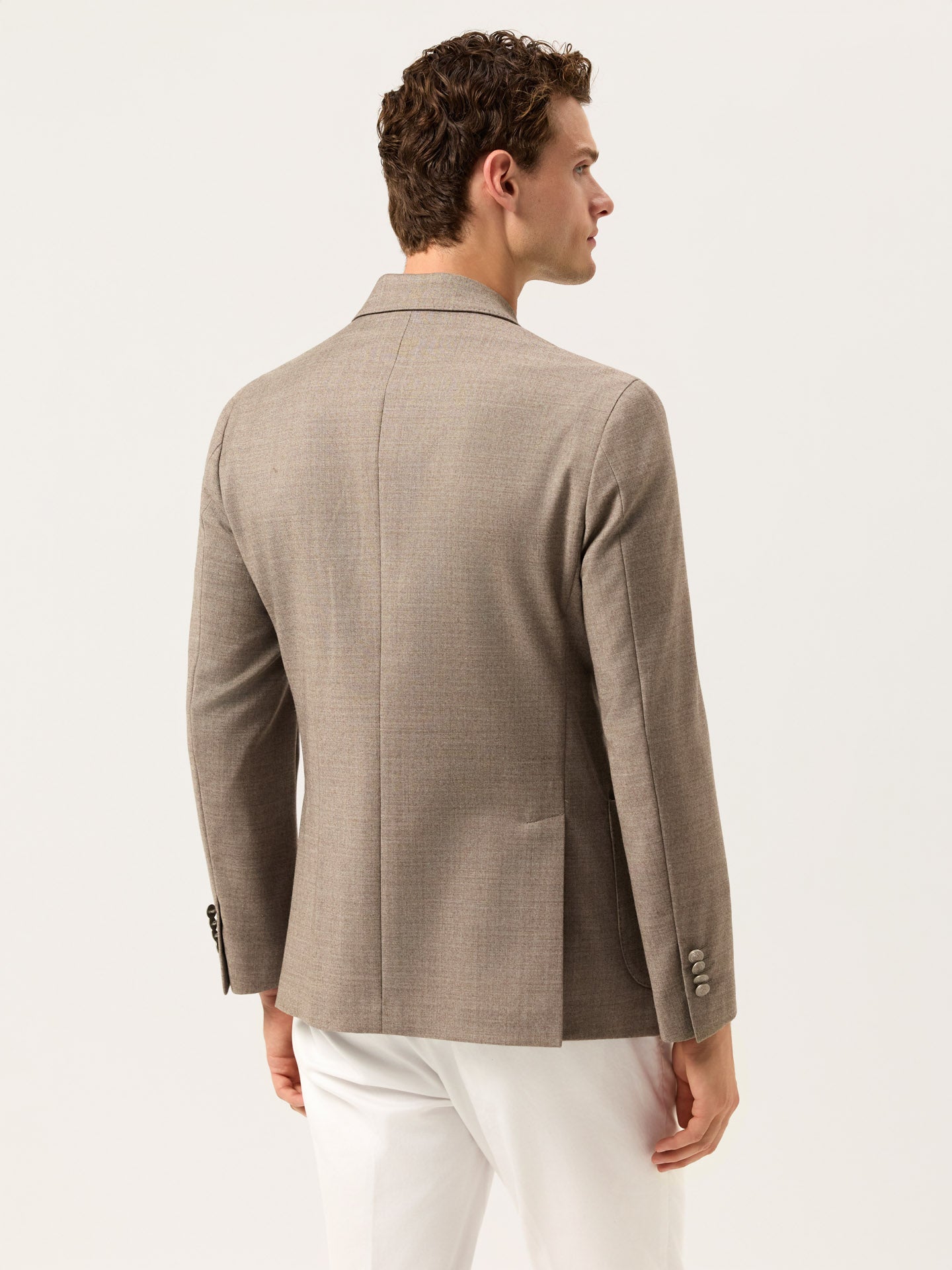 Tailored in a soft wool-blend flannel with natural stretch, this slim-fit blazer offers a refined yet relaxed silhouette ideal for winter. It features a classic two-button front, notched lapels with tonal AMF stitching, and patch pockets including an inner coin pocket for practical detail. The sleeve buttons are metal, matching the elevated tone of the piece, and the undercollar is crafted in self fabric for a polished finish. Two side vents ensure ease of movement, while the interior is half-lined with poly-viscose twill for smooth layering.