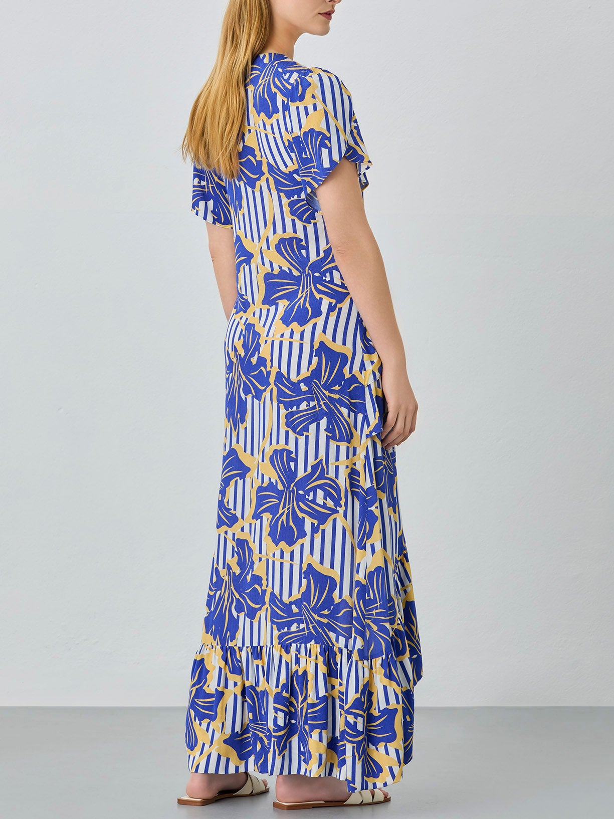 Assymetric made of Viscose and Lenzing Blend Jaquard fabric. Features with overlaping ruffles, an allover floral striped print and short sleeves. Fastening through invisible zipper on the side.