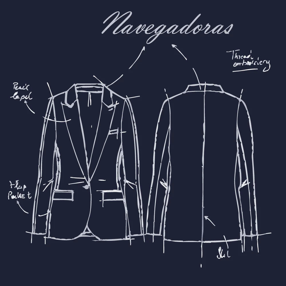 Born from the Atlantic heritage and Portugal’s maritime past, this design is a love letter to our heritage. The deep blue reflects the mysteries of the ocean, while the luminous white evokes the beauty of the iconic Portuguese pavement. The stripes draw inspiration from the markings on football pitches, a symbol of discipline and success. In short, this suit is a reflection of our past and the path we dare to walk.